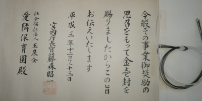 平成3年の天皇誕生日、天皇陛下から保育事業奨励の思し召しとして金一封を賜りました
